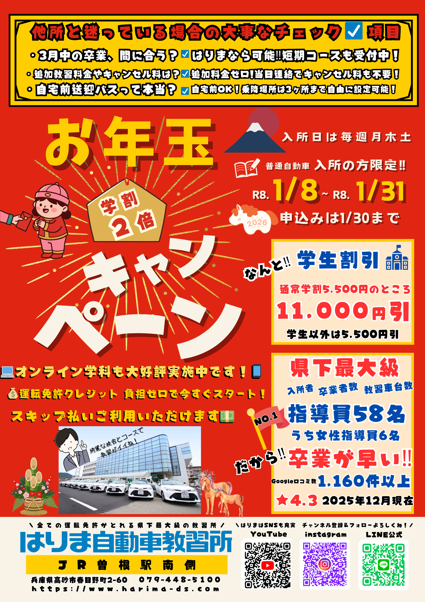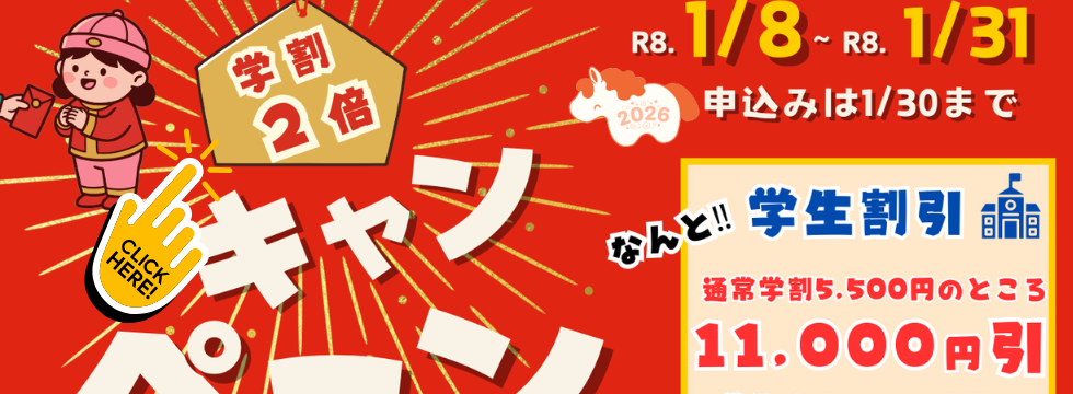 - キャンペーン 26.01.05 お年玉キャンペーン 1月中に入所で学割2倍‼