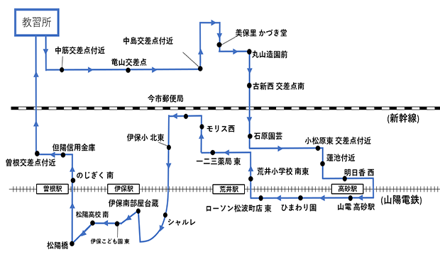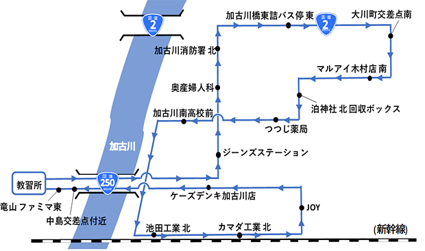 - ※到着時間が交通渋滞などにより遅れる場合がありますが、ご了承下さい。(教習所へお問合せ下さい)