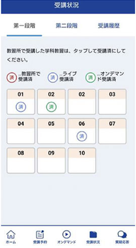 (7)教習映像を全て見終わると、 「受講状況」 の対象の学科番号に緑色の 「済」マークが自動的につきます。