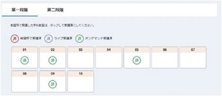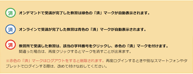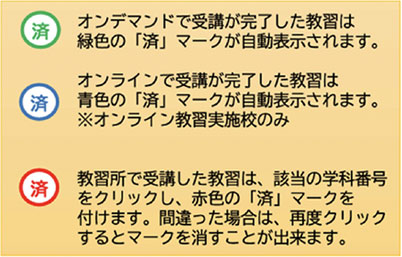 (7)教習映像を全て見終わると、「受講状況」の対象の学科番号に緑色の「済」マークが自動的につきます。