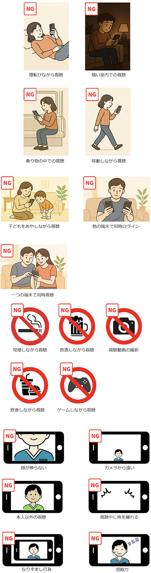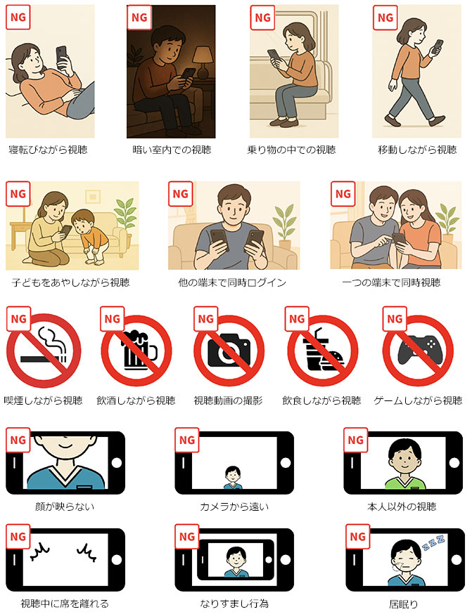 - 電話・会話・読書・掃除・調理・ゲーム・テレビの視聴・子どもの世話・ペットの世話・歯磨き・メイク・入浴等の教習と関係のない行為をしながらの受講はNGです。
